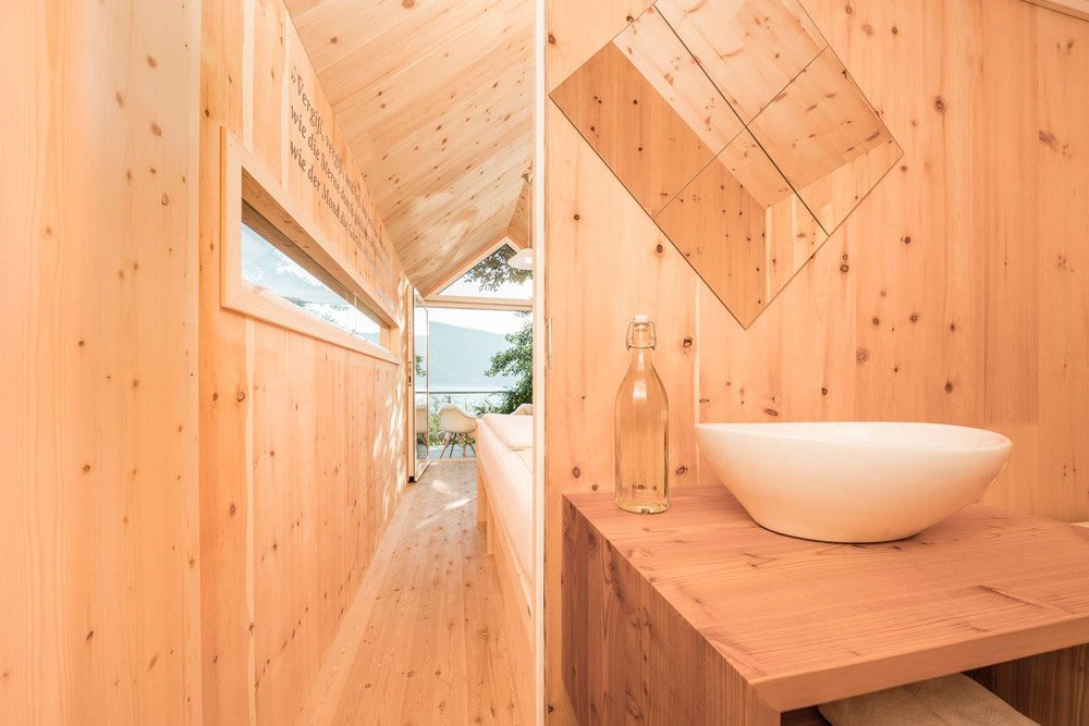 Das Biwak selbst ist bewusst minimalistisch gestaltet: Ein gemütliches Zirbenbett, eine Sitzgelegenheit und eine kleine Nasszelle sorgen für Komfort ohne Schnickschnack. Wasseranschluss gibt es hier nicht – stattdessen nutzen Sie unsere nahegelegene Sanitäranlage mit Warmwasser am Strand oder den Wellnessbereich des Hotels. Eine Trockentoilette ist vorhanden.